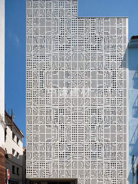 建筑幕墙墙体墙面装饰冲孔网冲孔板材料以铝板、镀锌板、不锈钢板为底材,经过冲压、整平、折弯、喷涂等工艺流程.